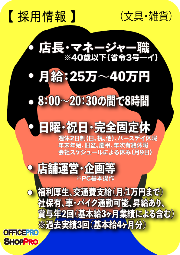 | 【待遇】 | ・車、バイク通勤可能(駐車場有) ・賞与(年2回。業績に基づく。(基本給3ヶ月分。業績、能力による含む。社員のみ) ※過去実績:年3回、基本給4ヶ月分支給。 ・通勤・残業・家族手当、各種社保完備、自店割引制度有 ・社員登用制度有