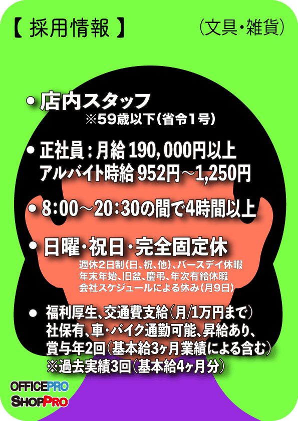 | 待遇 | ・車、バイク通勤可能(駐車場有) ・通勤・残業・家族手当、各種社保完備、自店割引制度有 ・社員登用制度有 |