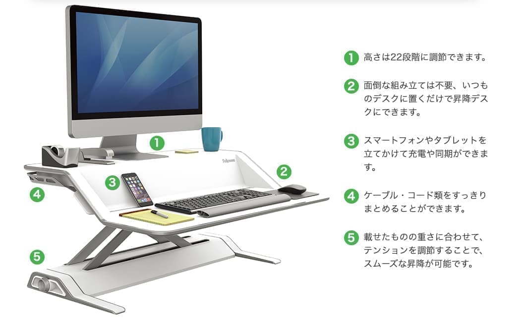 モニター、キーボード、ノート、筆記具はもちろん、飲みかけのコーヒーカップを載せたままで、 "ジワーッ" と、スムーズに昇降します。