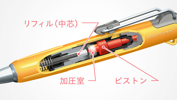 一般的なペンは、リフィルが上下する機能があるだけですが、このエアプレスはペンをノックするたび ピストンが加圧室を押しつぶしてリフィルに圧縮空気を送り、インクを押し出します。